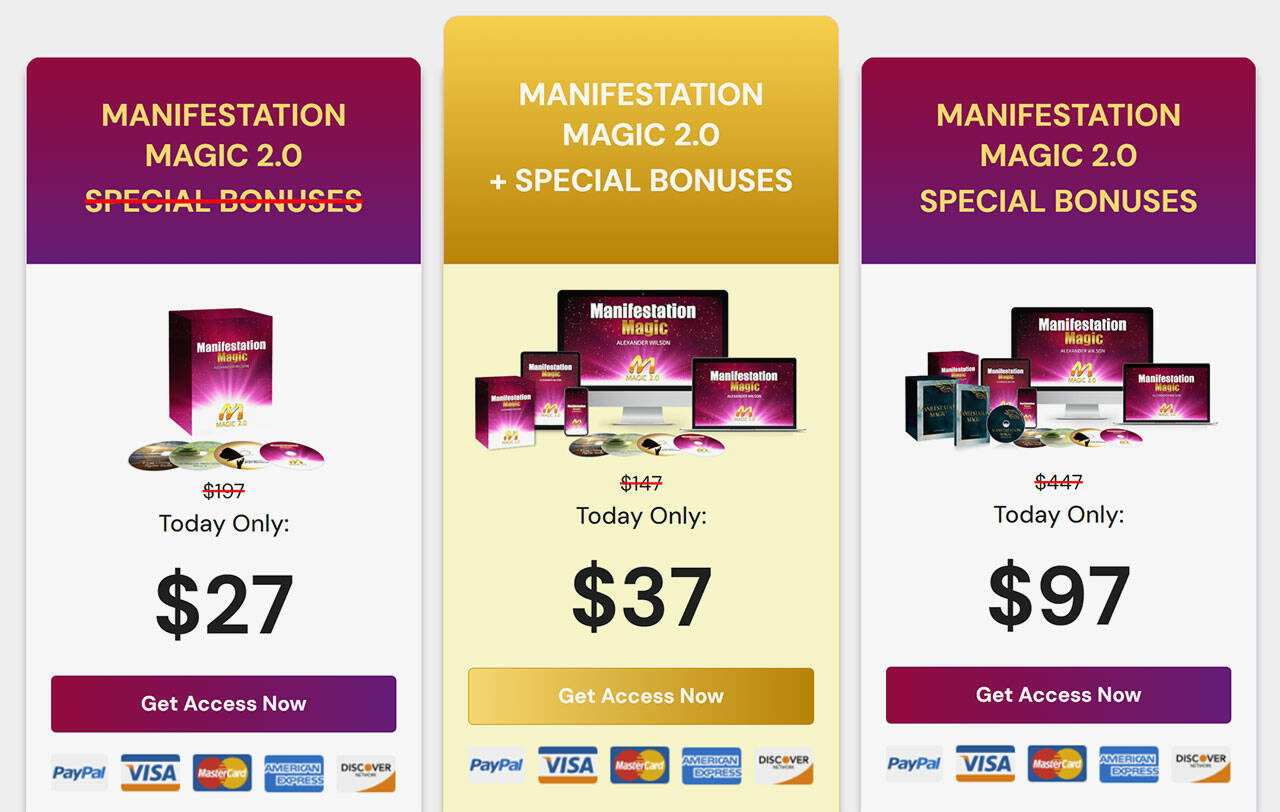 You can acquire the new Manifestation Magic 2.0 only through the official website. Customers receive the program and bonuses immediately after purchase. The following package options are available: