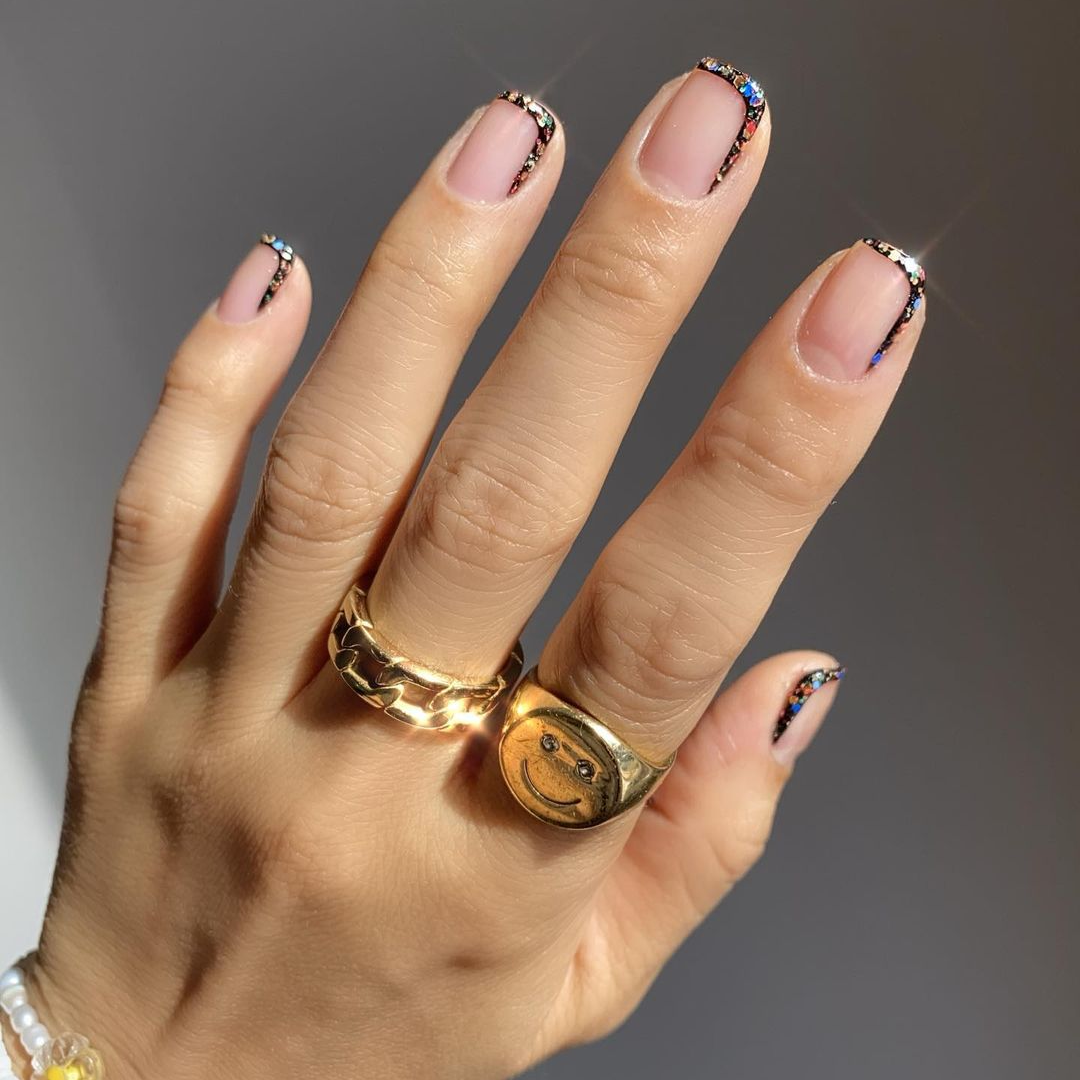 Go glitzy or go home, right? Perhaps we’re paraphrasing! But layering chunky glitter polish (and perhaps adding a ‘tip’ shape down one side) is always a good idea.