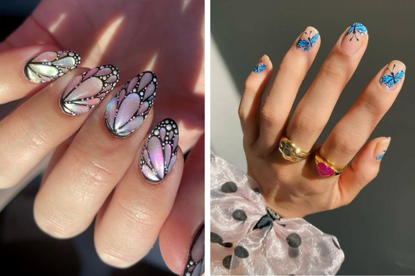 Tap into the whimsical ‘fairycore’ trend with some butterfly nail embellishments. Adding a bright decal over your neutral base is a great first foray into colourful nails – but we just can’t go past an iridescent wing design!