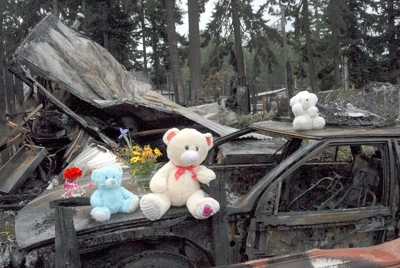 Jack Hutto of Port Angeles, father of Valerie Kambeitz and grandfather to Lilly, Emma and Jayden, placed teddy bears that belonged to his grandchildren next to the burned mobile home.