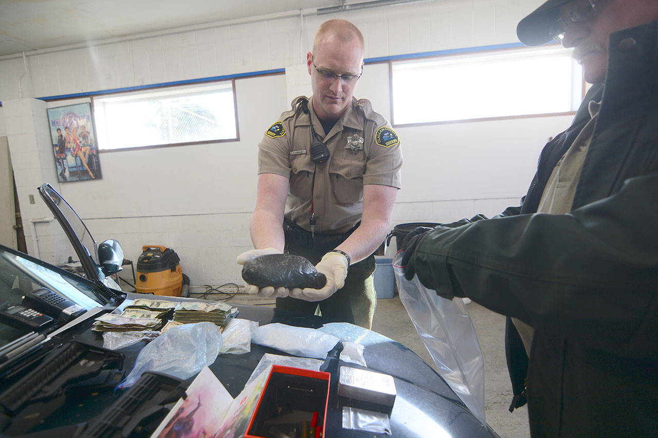 PORT ANGELES — A report of a suspicious vehicle east of Port Angeles on Sunday ended with Clallam County Sheriff’s Deputies Paul Federline and Eric Morris seizing 950 grams of heroin, more than 400 grams of methamphetamine, four guns, about 20 cellphones, dozens of car keys, 100 ounces of silver and about $9,000 in cash.