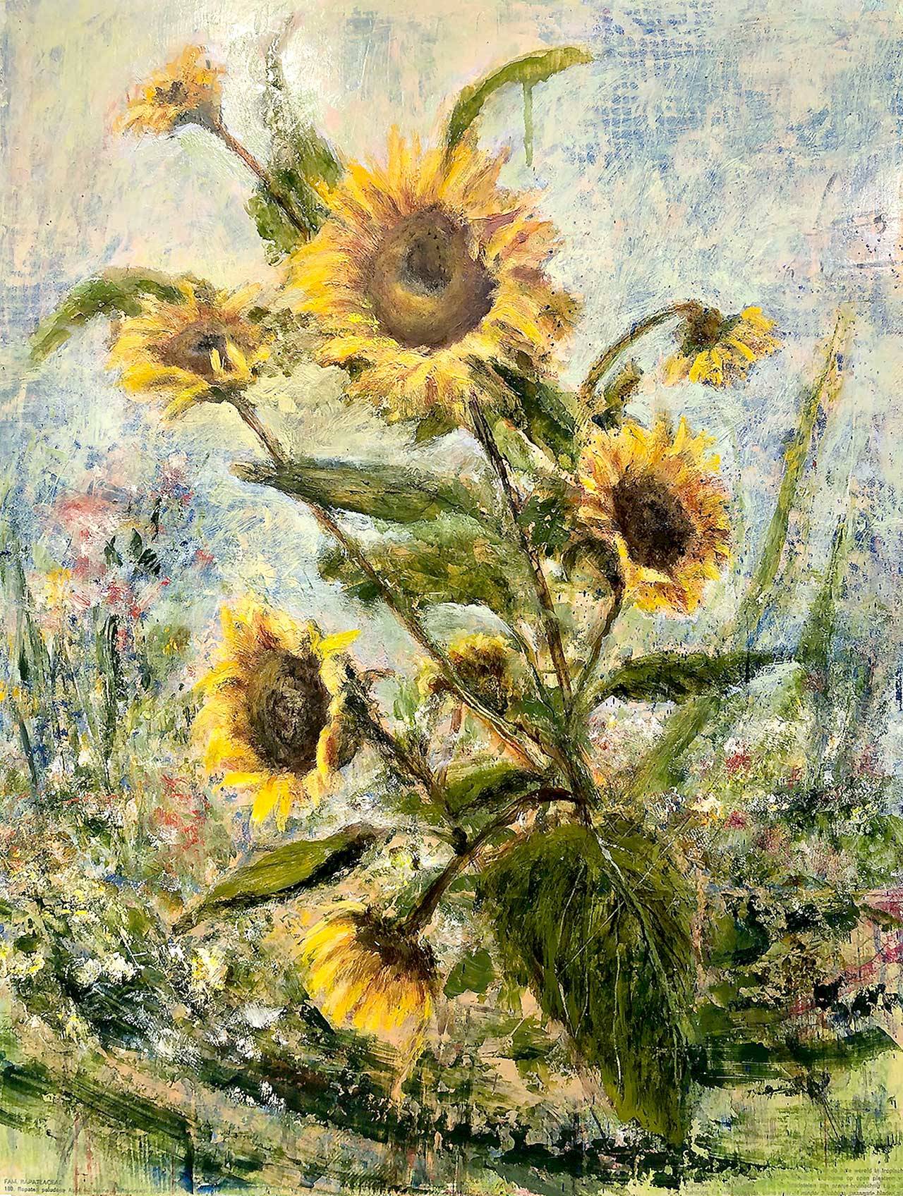 The mixed-media paintings she is presenting at the gallery use floral compositions. Collage is applied to a prepared wood surface and then the painting is developed with, first, layers of thin acrylic color, then oil colors, cold wax medium and glazing.