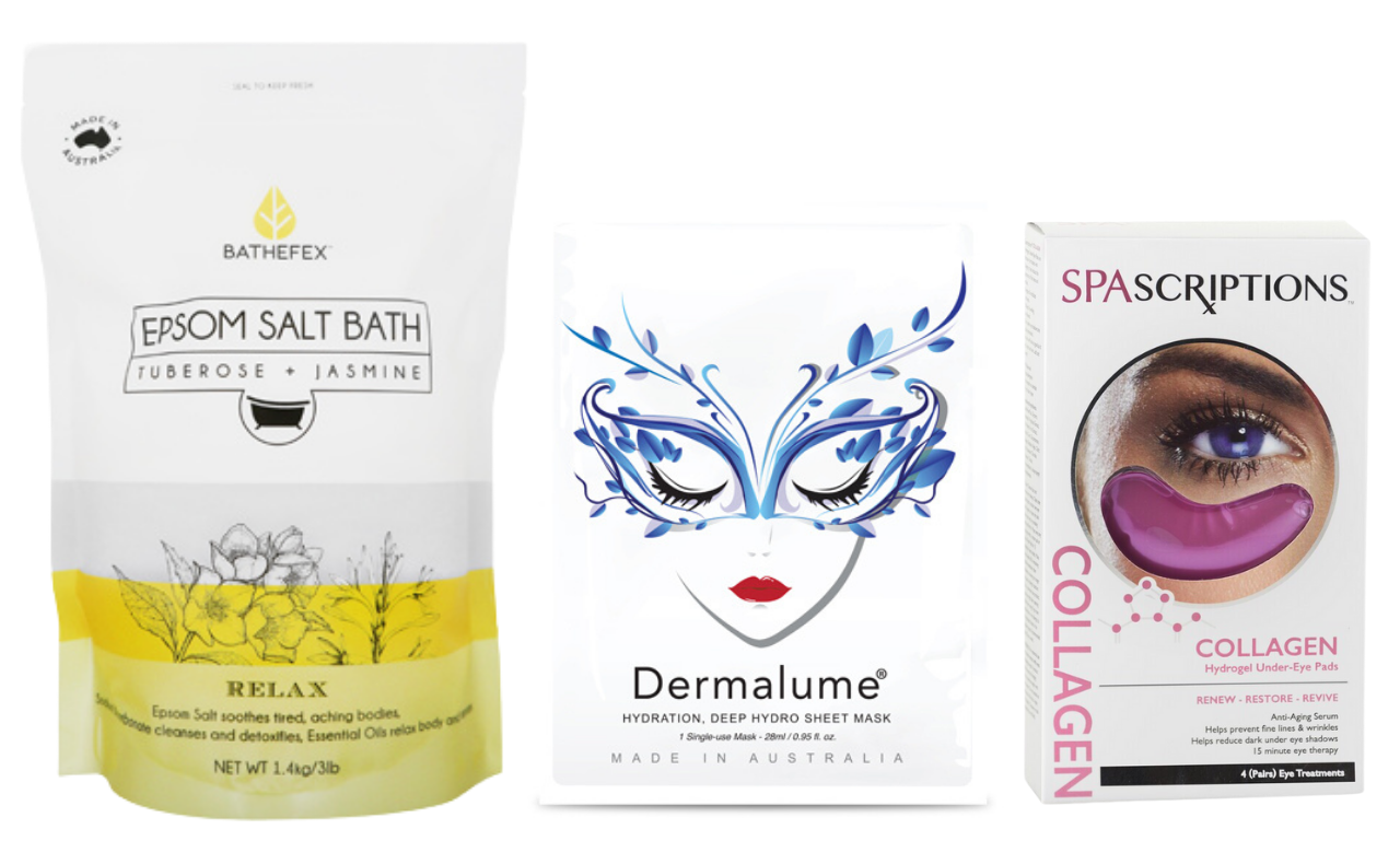 bh recommends: BATHEFEX EPSOM SALT – TUBEROSE + JASMINE ($12.99 at bathefex.com.au), Dermalume Hydration, Deep Hydro Sheet Mask ($23 for 5x masks at dermalume.com.au), and Spascriptions Hydrogel Under Eye Mask – Collagen ($6 at Big W).