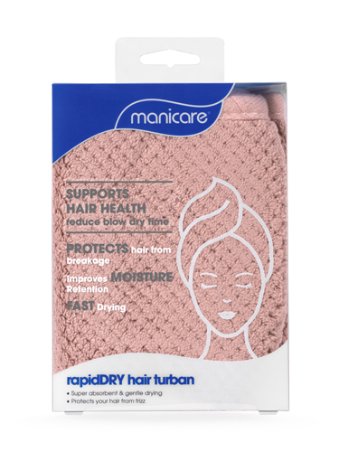 Manicare RapidDry Hair Turban 1pk is made from premium microfibre material. The material is very absorbent, helps protect hair by reducing frizz, split ends and breakage. One size fits all.