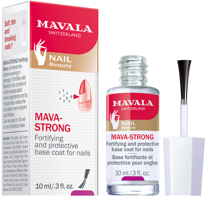Mavala Mava-Strong is a base coat that fortifies and protects the nails. The colourless formula contains a complex of micro-encapsulated active ingredients, including tea tree essential oil, vitamin E, keratin and arginine, to restructure and improve the quality of the nail surface. Crystal resin tears produced by the pistachio mastic tree help the nail plate become harder and thicker. Suitable for soft, thin nails that are prone to breaking.