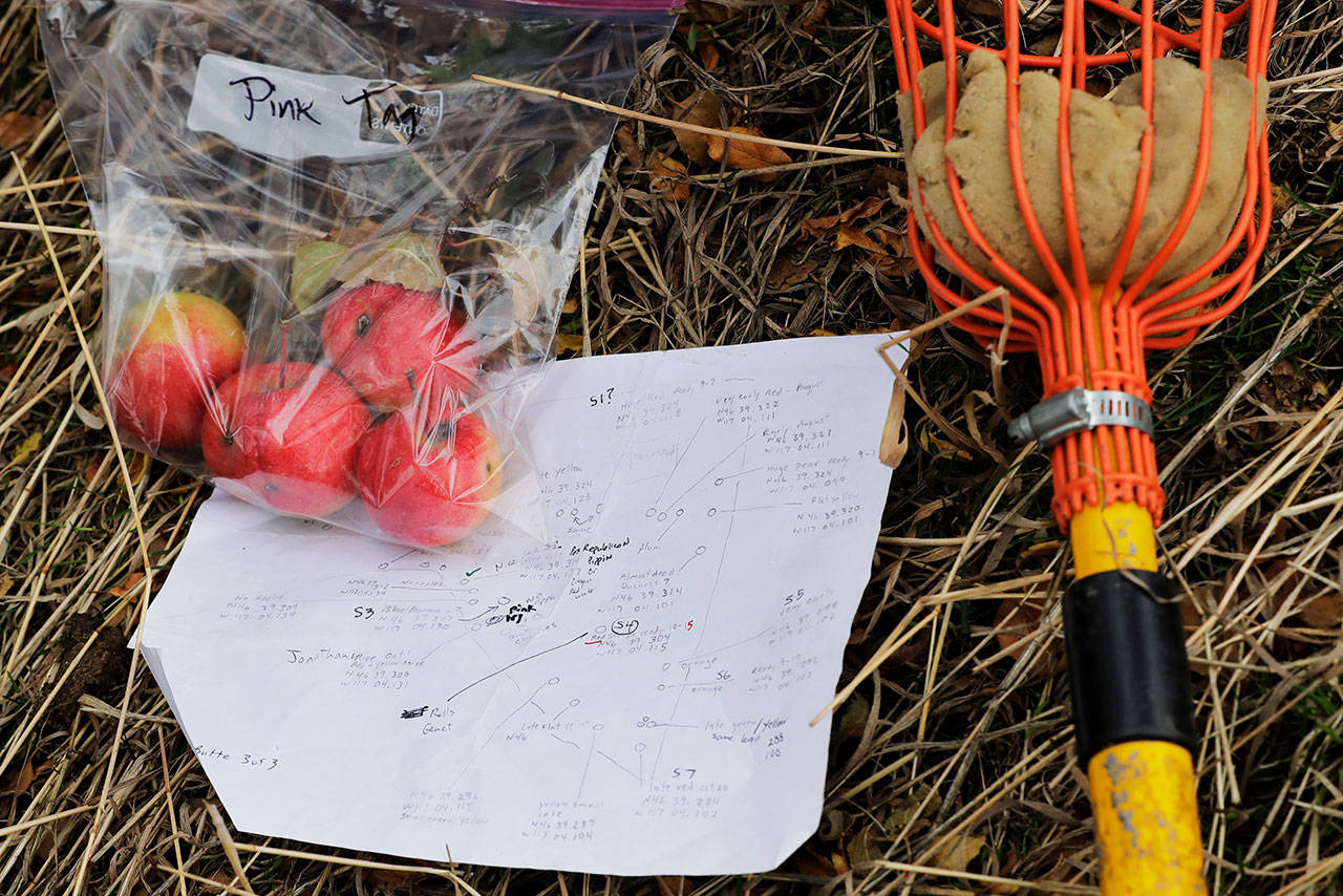 By matching names from those records with property maps, they can pinpoint where an orchard might have been — and they often find a few specimens still growing there. The pair carefully note the location of each tree using GPS and tag the tree with a plastic band before bagging the apples in zip-close bags and shipping them to the Oregon experts for identification.