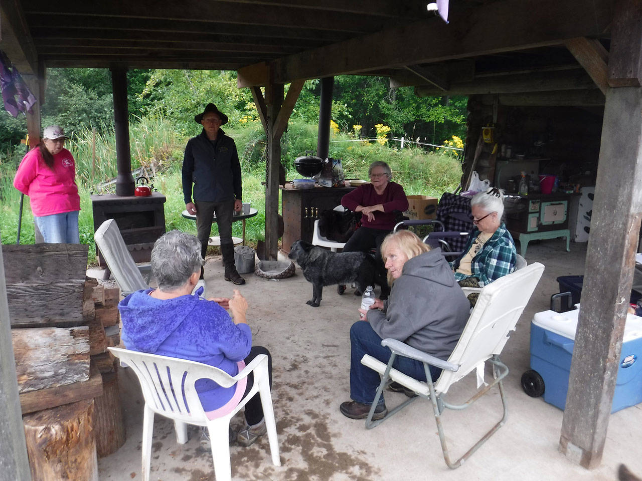 The kitchen sits in a meadow next to a large pond and is quite quaint. The supports, roof trusses and back walls of the semi-enclosed building are made from old logs Margaret thinks are from the original homestead. It’s got a refrigerator, a 1949 army range cook stove, vintage wood stove and large seating area that now sit on a concrete slab thanks to Jennifer and her husband.