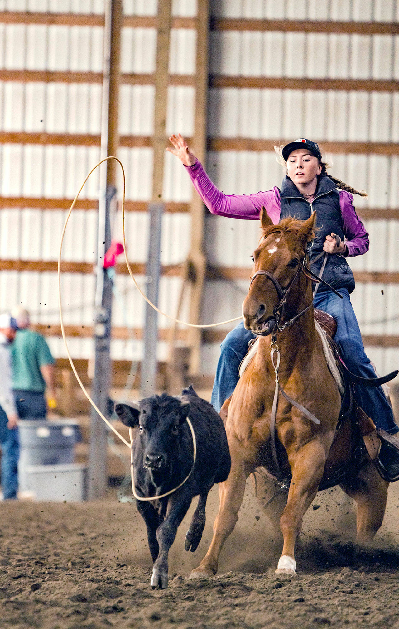 Lillian Bond, readying her lariat, works to calm her horse down briefly while in the box next to the chute that has a spring-loaded rope, known as the barrier, stretched in front. As soon as she nods her head, the barrier is opened.