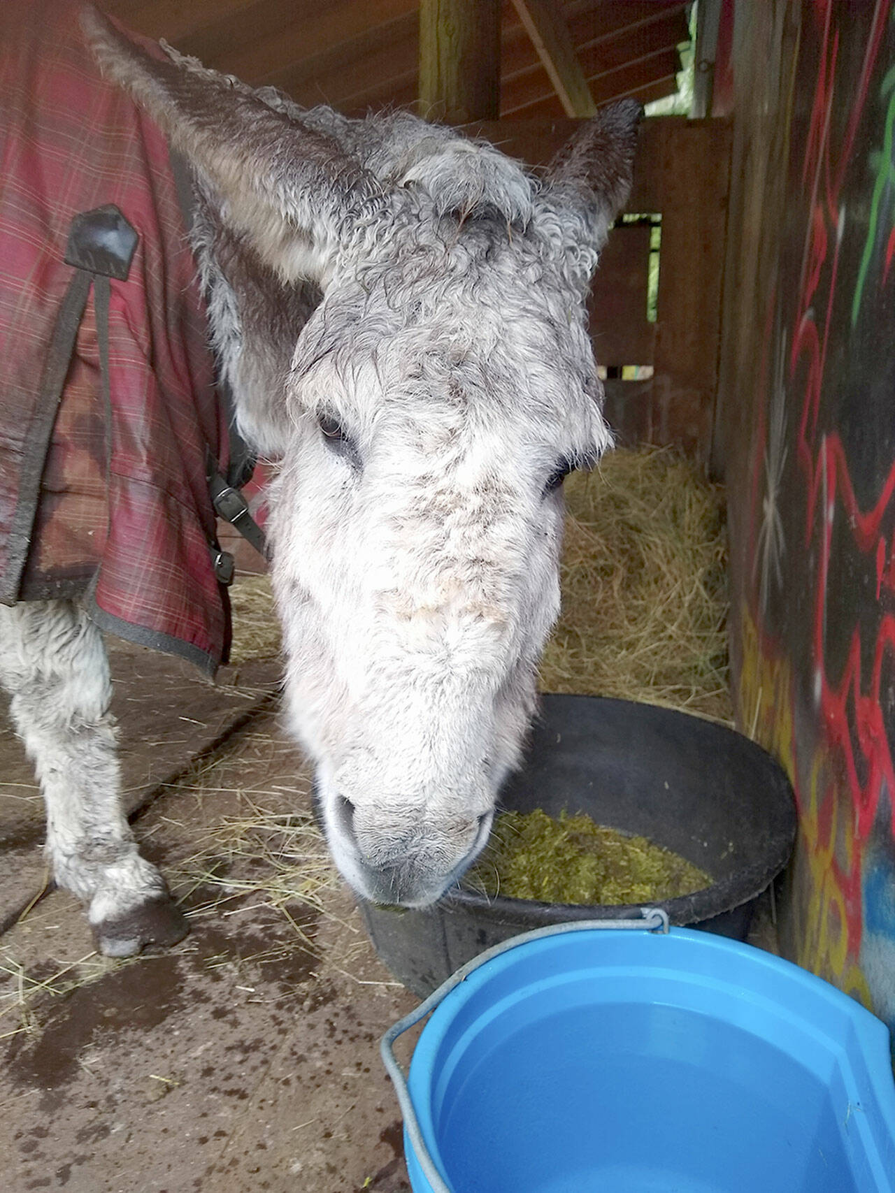 Close friend Zorina Barker called me in tears earlier in this week to share her frustrations over her inability to provide her family’s donkey, Broo, 30, with veterinary care last weekend when he was suffering through a night of severe choking and gagging after eating alfalfa pellets, some of which formed a mass in his esophagus tube.