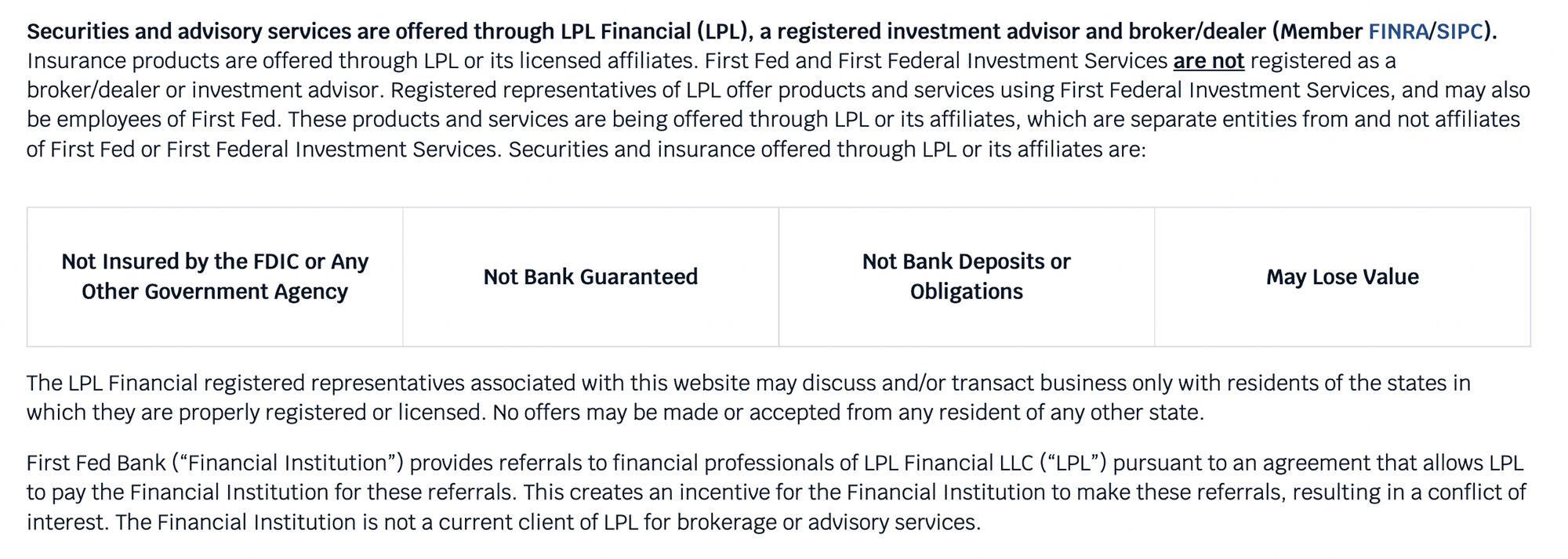 To connect with an LPL financial advisor at First Federal Investment Services visit: ourfirstfed.com/investment-services