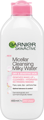 Garnier Micellar Cleansing Milky Water is a cleansing water that hydrates and comforts dry, sensitive skin. Garnier combines the efficacy and lightness of micellar cleansing water with a touch of milk for cleansed, makeup free and hydrated skin. With just one cotton pad and without rubbing, Garnier Micellar Cleansing Milky Water removes impurities and make-up without drying out skin.