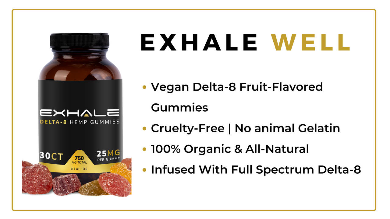 - Exhale Hemp THC Gummies contain zero animal gelatin, making them vegan-friendly and other animal rights champions.