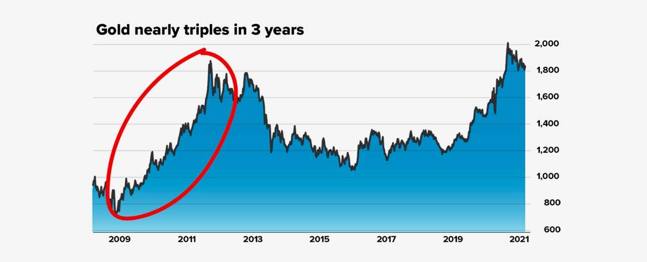 During the last financial crisis in 2008, gold nearly tripled from $700 to $1,900