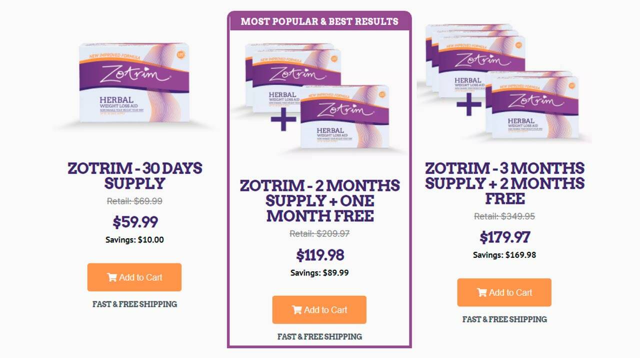 Zotrim goes for $58 per bottle and a bottle lasts for 30 days. You can make a purchase on the official site and get a discount. To get bigger discounts, you can purchase a package instead of a single bottle. For instance, if you get the 6-month supply, you will get a bottle at $33. You can enjoy a 10%discount when you make a purchase on their site.