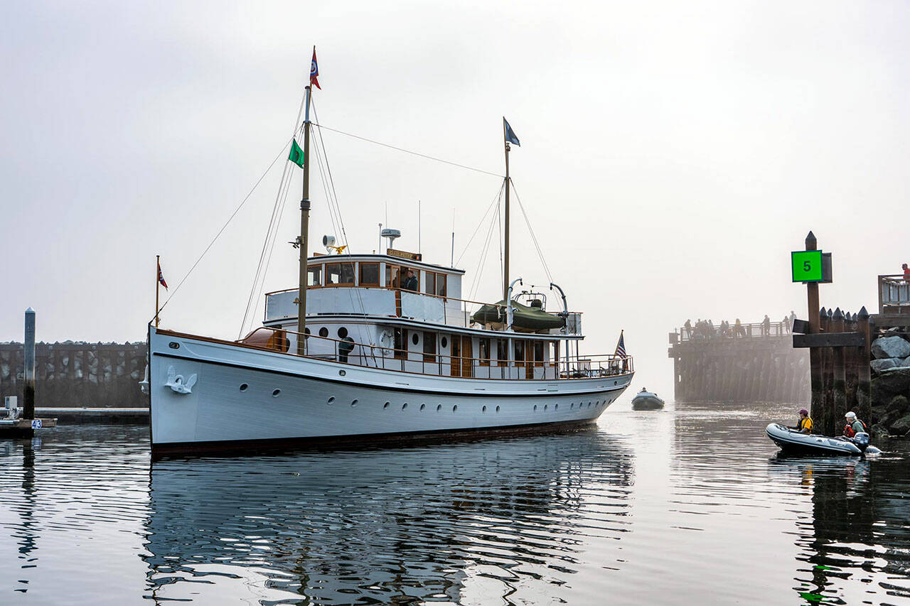 From out of the fog in Port Townsend Bay on Thursday morning, the 97-year-old yacht Blue Peter passes by spectators who lined the pier at the entrance to Point Hudson Marina.