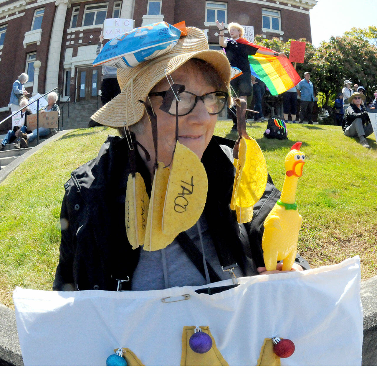 A demonstrator carrying an American flag walks the sidewalk in front of the Clallam County Courthouse on Saturday.