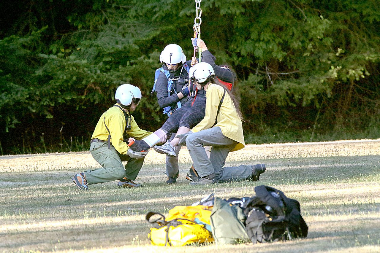 A Mount Rainier National Park ranger was lowered from the helicopter and hoisted Benitez off the mountain and back to Lake Crescent Lodge, where a Clallam County Fire District No. 2 ambulance was waiting, Maynes said.