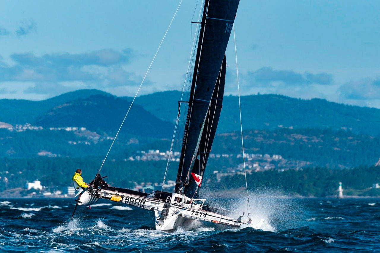 Trickster, a 28½-foot trimaran with pedal drives and paddles, was raced by crew members Greg Rohner, Rafe Beswick, Eric Egge and Scott Schoch of Olympia.