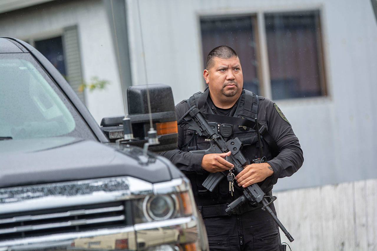 Officers with the Port Angeles Police Department, Clallam County Sheriff’s Office, State Patrol, Lower Elwha Klallam Tribal Police Department, Department of Corrections, Border Patrol and state Fish & Wildlife arrested several people who initially would not exit a trailer in the park, officials said.
