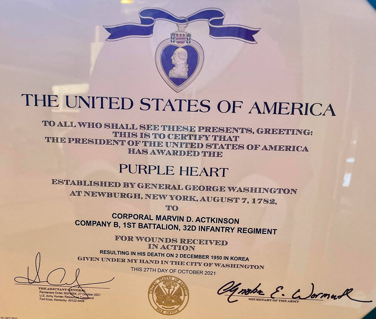 According to military sources, Actkinson — a member of Company B, 1st Battalion, 32nd Infantry Regiment, 7th Infantry Division — was reported missing in action on Dec. 2, 1950, after his unit was attacked by enemy forces as they attempted to withdraw near the Chosin Reservoir in North Korea. Following the battle, his remains could not be recovered. He was officially presumed dead on Dec. 31, 1953.