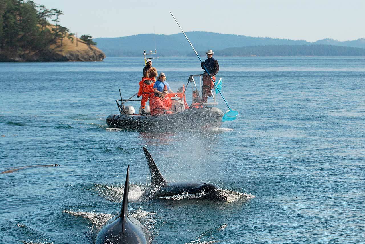 SEATTLE — For more than a decade, Brad Hanson and other researchers have tailed the Pacific Northwest’s endangered orcas in a hard-sided inflatable boat, leaning over the edge with a standard pool skimmer to collect clues to their diet: bits of orca poop floating on the water, or fish scales sparkling just below the surface.