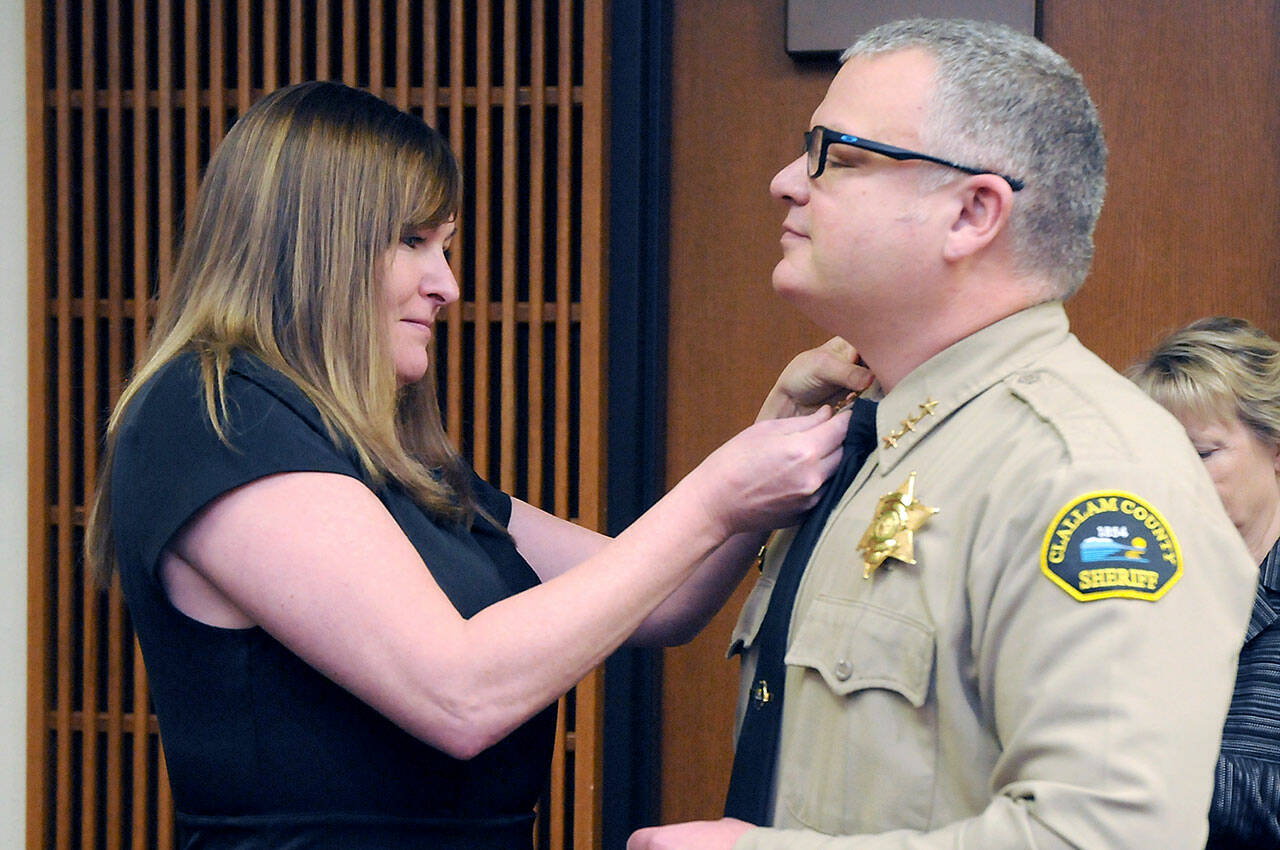 Incoming Clallam County Sheriff Brian King, right, receives his sheriff star from his wife, Brenda King, after he was sworn into office by Superior Court Judge Lauren Erickson on Wednesday at the Clallam County Courthouse. (Keith Thorpe/Peninsula Daily News)