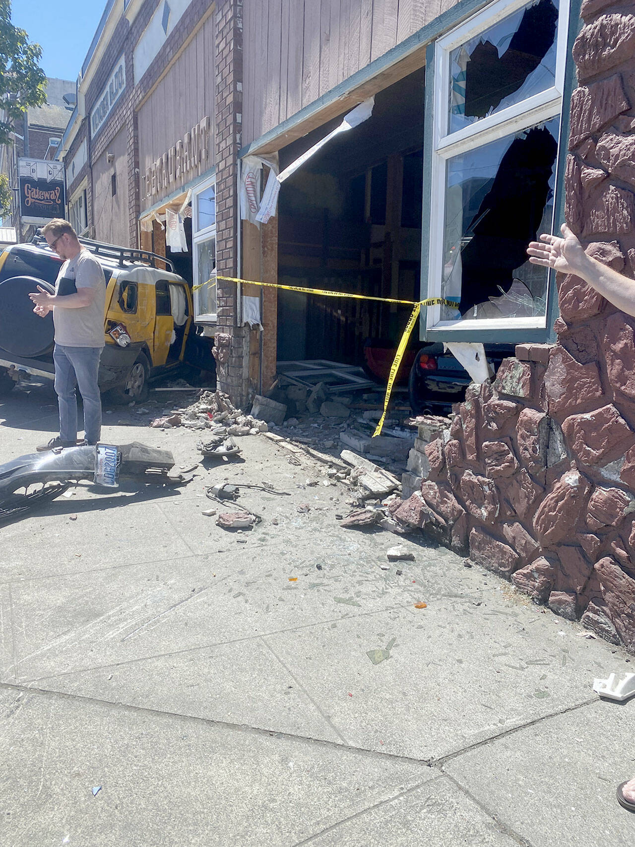 The initial report from Port Angeles Police Sgt. Clay Rife said the two vehicles were turning onto Lincoln Street from Front Street when the accelerator in a black Lexus became stuck. The driver hit a yellow Toyota FJ Cruiser, sending both vehicles into the building.