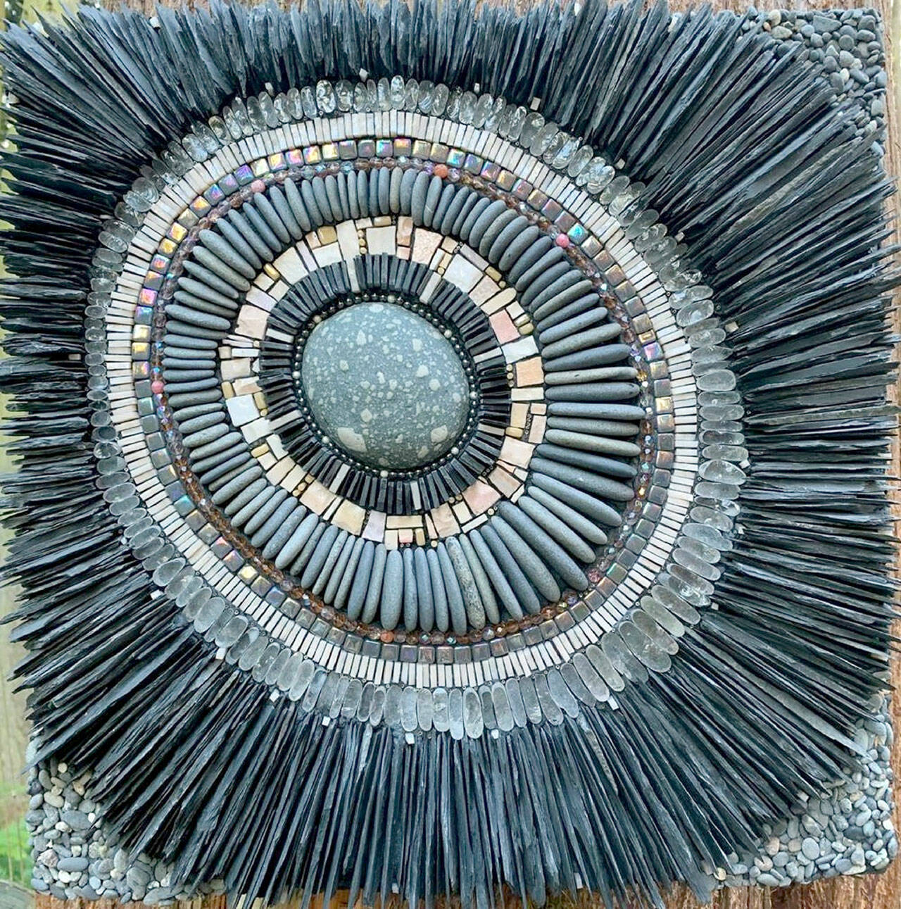 Shelley Jaye, a geologist, also walks the beach with her pup, Leon. Her art form is mosaic. One of the new artists in Showcase 2024, Jaye forages rocks and turns them into complex works of art.