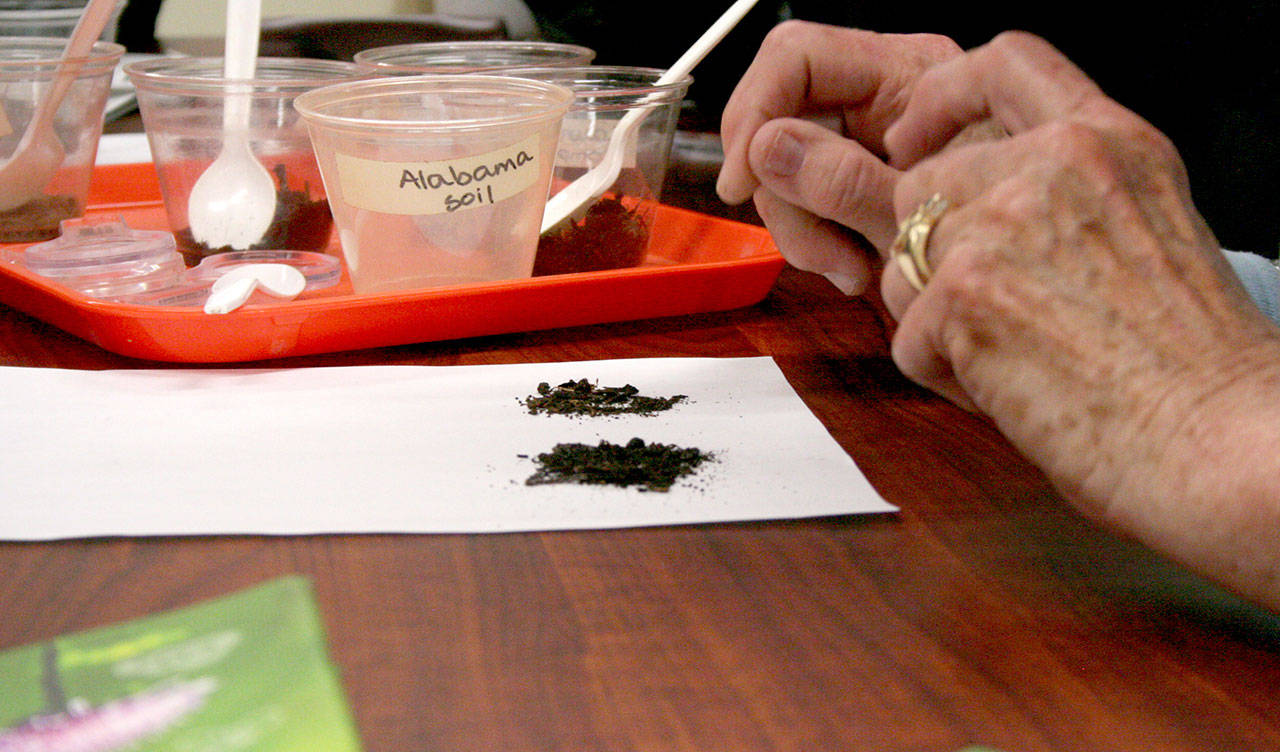 Class participants sifted through several small containers of soils, from store-bought compost to samples from other locations. They used magnifying glasses to see if they could find any differences between them.