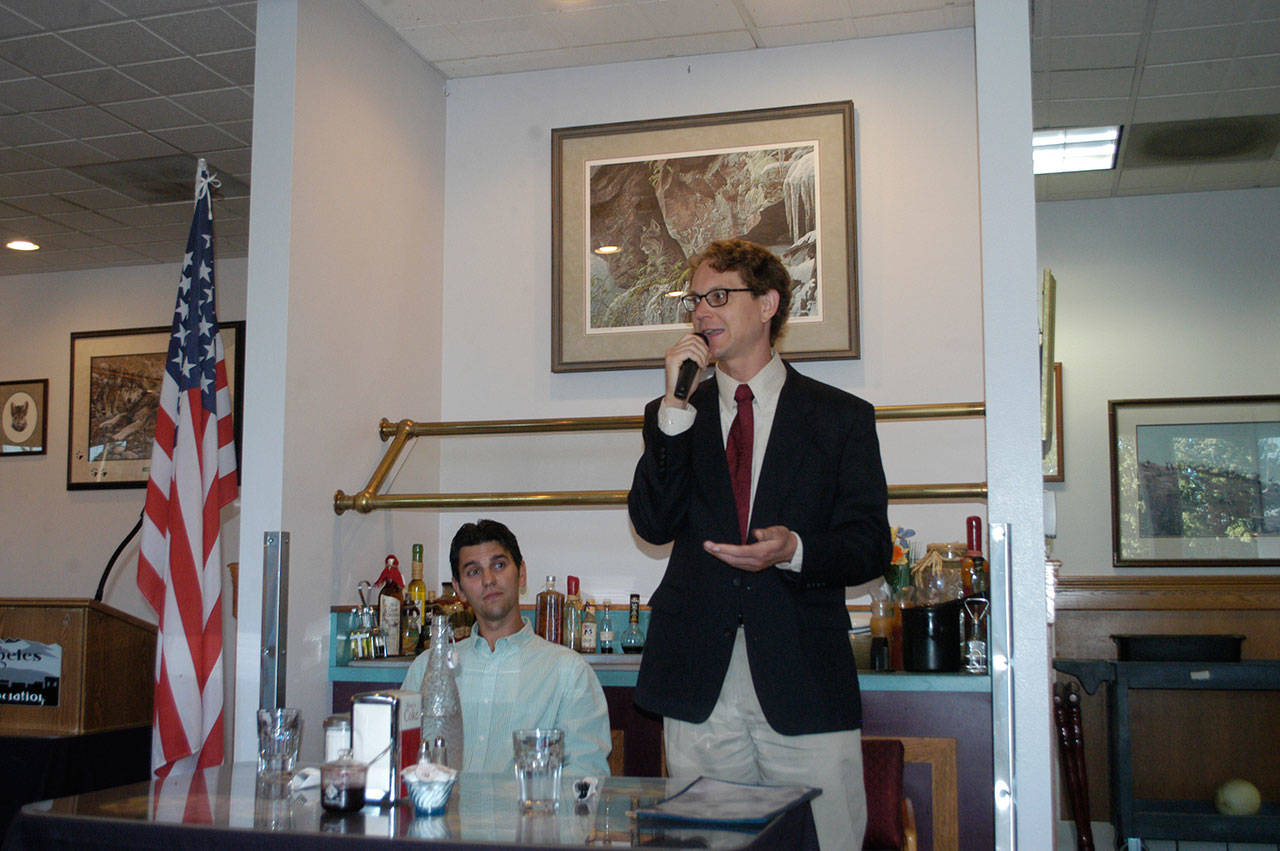 Lindsey Schromen-Wawrin and Artur Wojnowski disagreed on how to answer a Nov. 7 advisory vote on fluoridated drinking water, annexation and other issues during a Port Angeles Business Association forum at Joshua’s Restaurant.