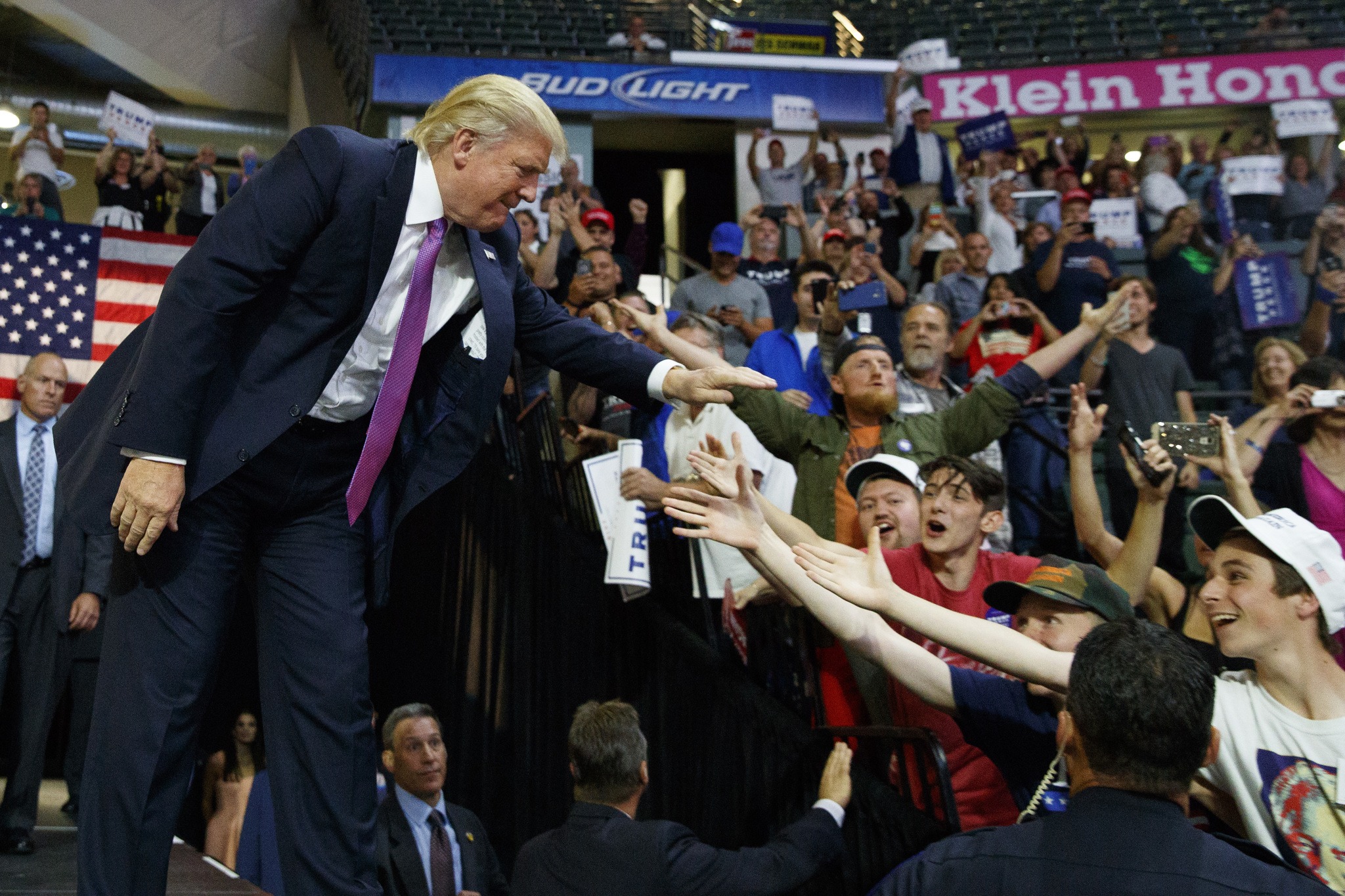 The New York businessman’s speech to cheering backers at Xfinity Arena was interrupted several times by protesters who were escorted out of the facility.