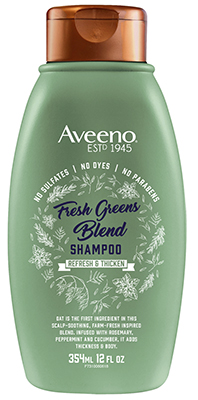 Aveeno Fresh Greens Blend Shampoo is a scalp-soothing shampoo that delivers thickness, body and light moisture. It has a refreshing blend infused with rosemary, peppermint and cucumber.