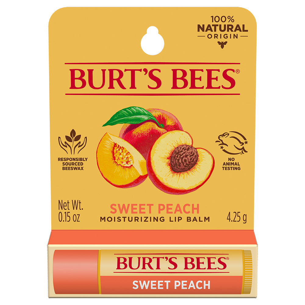 Burt’s Bees Sweet Peach Moisturising Lip Balm is a flavoured lip balm that instantly softens and hydrates your lips to help prevent dryness, cracking or chapping. Infused with responsibly sourced beeswax to richly moisturise and soothe lips, the nourishing oils and butters will make your lips juicy, happy and healthy.