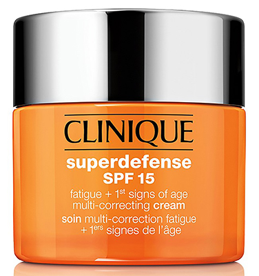 Clinique Superdefense SPF 15 Fatigue + 1st Signs of Age Multi-Correcting Cream is a fatigue-fighting, daytime moisturiser. It awakens instantly and continuously, with 12 hours of anti-fatigue radiance for more youthful-looking skin. It helps to visibly correct first signs of ageing, uneven texture, dullness, fine lines and wrinkles, while defending against a full spectrum of modern aggressors. Key ingredients/technology includes: Stop Signs™ Technology, sunscreen ingredients, a blend of antioxidants such as vitamin C, vitamin E and ergothioneine, and alibizia julibrissin bark extract, caffeine and an energy blend of creatine and carnitine. Sweat and humidity resistant. Oil-free.