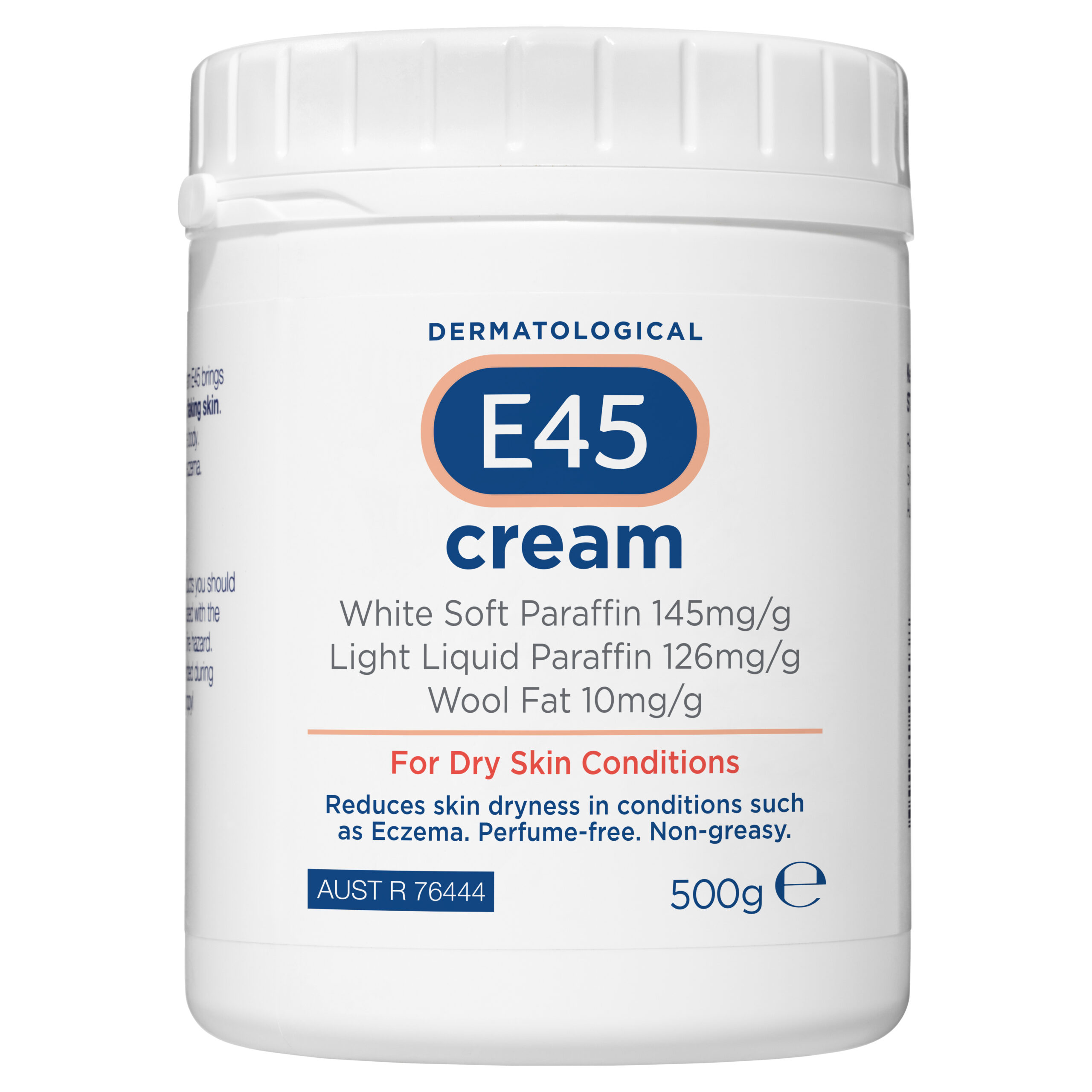 The E45 cream is a non-greasy emollient that is quickly & easily absorbed by skin. Apply 2-3 times daily to all parts of the body, even when skin is healthy.