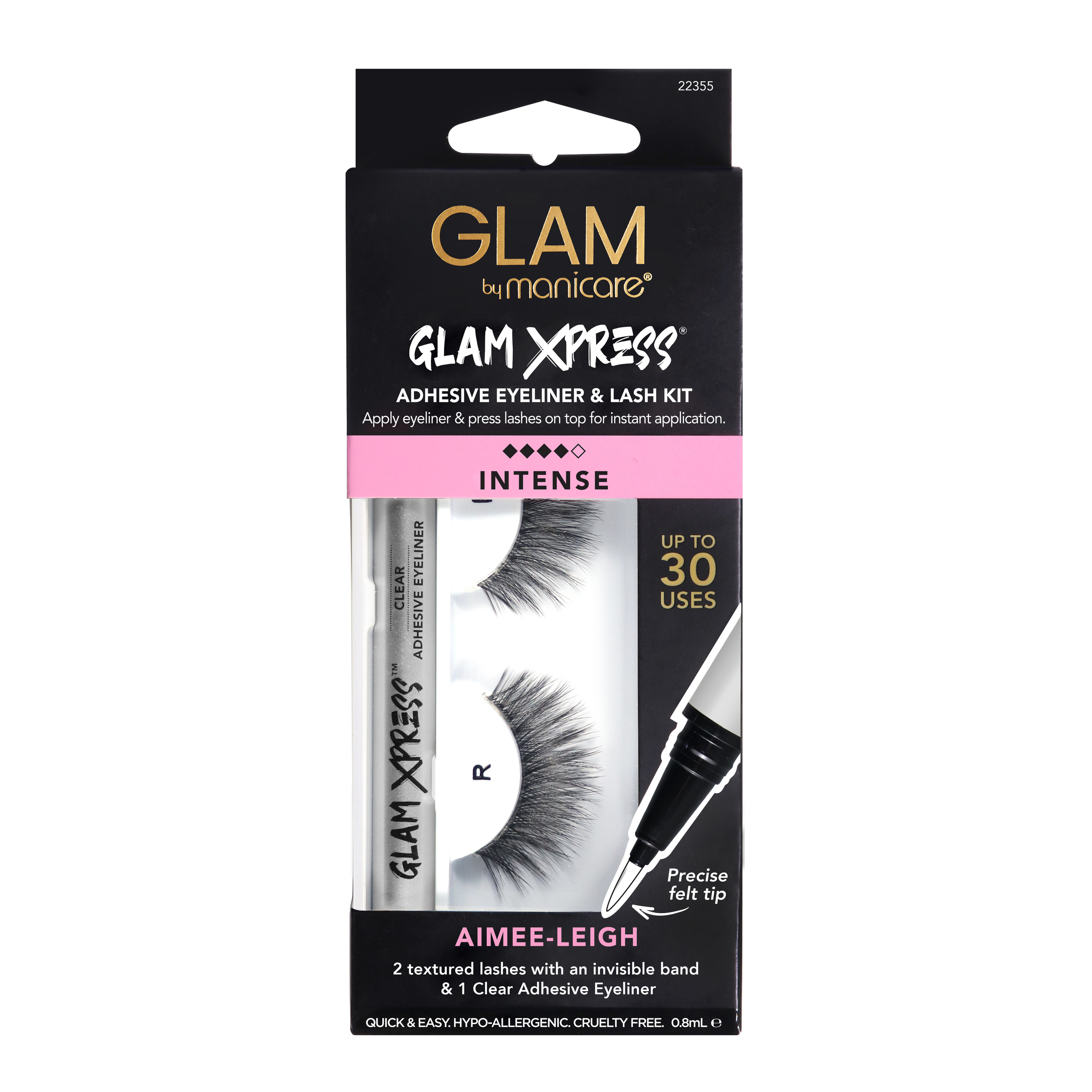 GLAM by Manicare® Glam Xpress Clear Adhesive Eyeliner & Lash Kit – 76. aimee-leigh uses a tech smart clear eyeliner with lash adhesive for seamless and express application. Simply apply the clear eyeliner along top of lash line and press strip lashes on top for instant application. Create a flawless lash look with the long lasting and waterproof clear adhesive eyeliner paired with lightweight clear banded lashes for invisible application designed to last all day. 2 textured lashes with an invisible band & 1 Clear Adhesive Eyeliner.