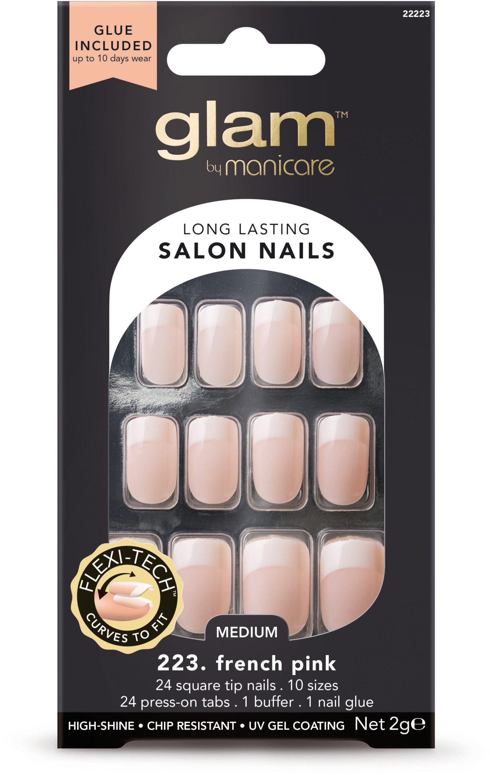 GLAM by Manicare® Glue-On Nails – French Pink Medium Square are false nails with a pink French manicure design. The kit includes 24 medium square tip nails in 10 different sizes as well as 24 press-on tabs, nail buffer and nail glue.