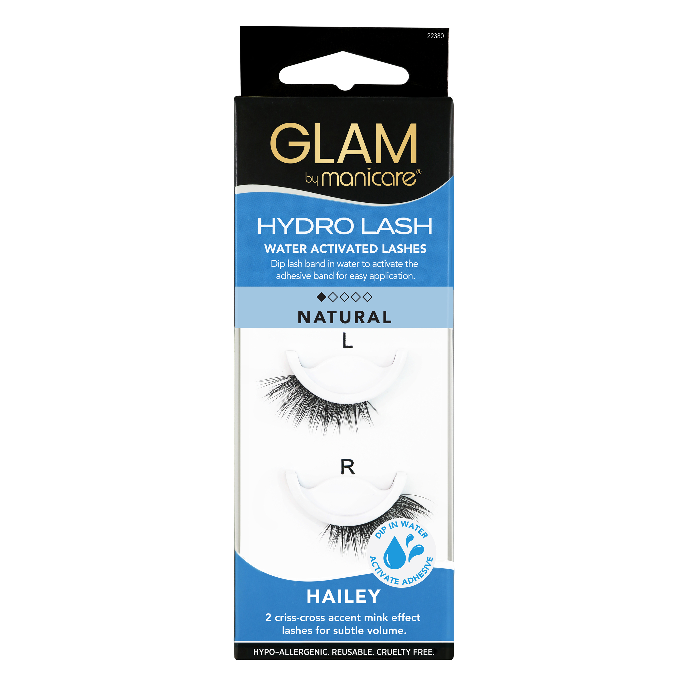GLAM by Manicare® HYDRO LASH uses a revolutionary water activated band for effortless application without the need to apply lash adhesive. Simply dip lash band in water to activate the adhesive and apply onto lash line. Designed for long lasting wear and a lightweight finish. From a natural finish to a dramatic lash effect, GLAM by Manicare® has lashes to suit every occasion. The style 80. hailey has a criss-cross accent mink effect for subtle volume.