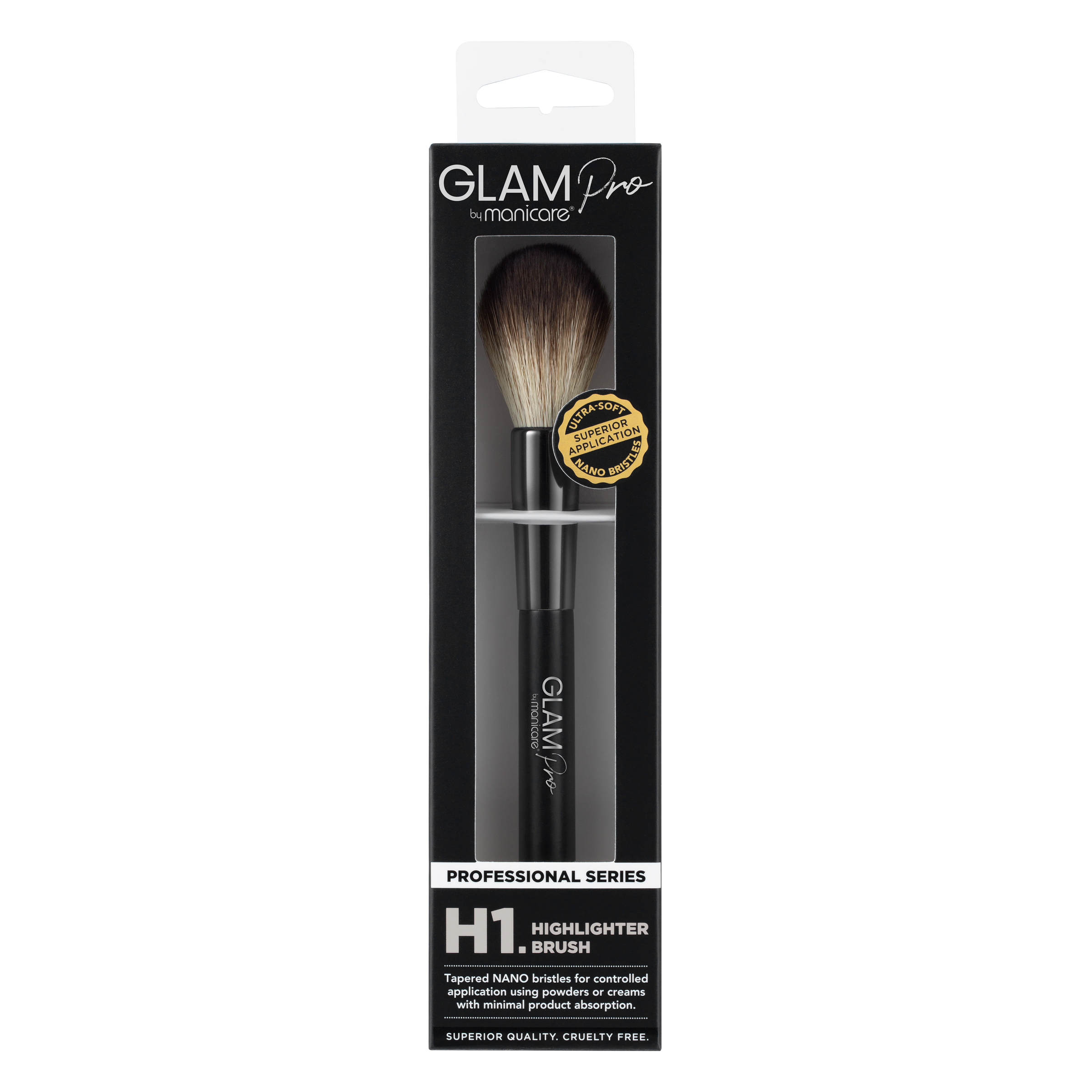 GLAM by Manicare® Pro Series – Highlighter Brush has tapered bristles to allow for controlled application of illuminating cream or power pigments on the tops of cheekbones, the bridge of the nose, the cupid’s bow and the décolleté. Designed to blend products softly and accentuate features with precision to achieve a subtle sun kissed effect or more intense glow up. The range is designed for flawless application using unique NANO bristle technology for ultimate softness and superior performance. Each brush in this series incorporates high quality ultra-soft synthetic bristles that absorb less product resulting in smooth and even application.