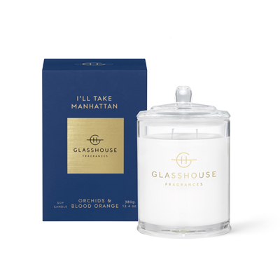 Glasshouse Fragrances I’ll Take Manhattan – Orchids and Blood Orange Soy Candle is a candle inspired by the Big Apple, feel the tingle of electric pulse. Alluring and testing. Tempting. Teasing. Rewarding only the bold. It’s all here for you with one spark – a flood of orchids, rose, musk and blood orange. Top: gardenia, tulip, orchid, redcurrant; middle: black rose, carnation, nectarine, blood orange; base: amber, patchouli, sandalwood. Fragrance strength: 4.
