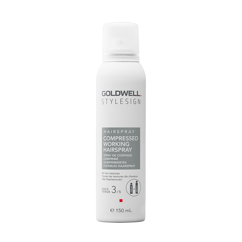 Goldwell StyleSign Compressed Working Hairspray instantly provides flexible to ultra strong hold for all hair textures. For long-lasting styles with high humidty and frizz restistance for up to 72 hours. Spray onto dry hair. For all hair textures.