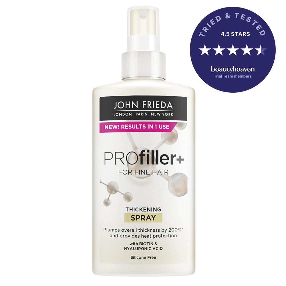 John Frieda PROfiller+ Thickening Spray is a styling spray for hair that looks and feels thicker, fuller and stronger in just one use. Infused with Biotin, known to provide hair with strength, and Hyaluronic Acid, known to hydrate hair, this double-duty styling spray provides heat protection and reduces hair loss due to breakage.