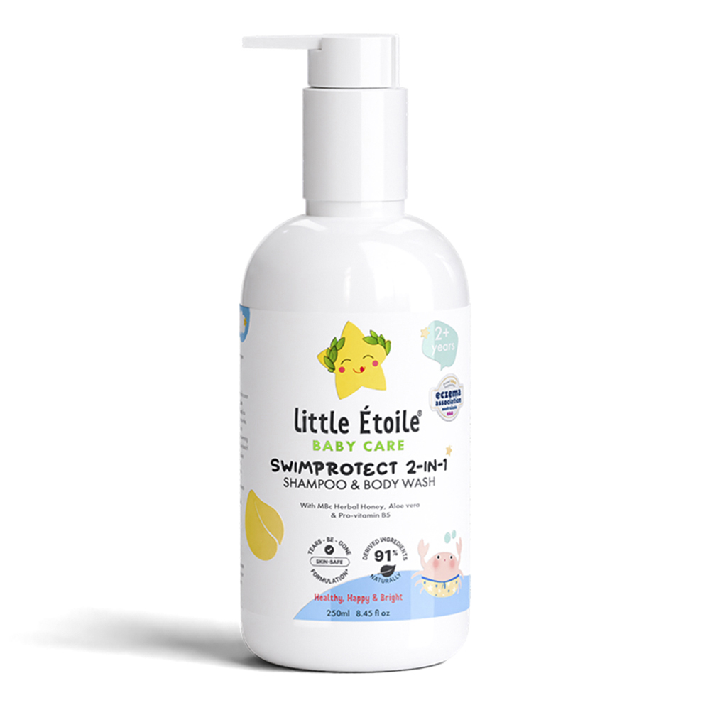 Little Étoile® Care SwimProtect 2-In-1 Shampoo & Body Wash (2+ Years) is a shampoo and body wash that has been scientifically developed to neutralize chlorine and chemical impurities, allowing for the restoration of bleached and weakened hair, skin and scalp after swimming & water sports.