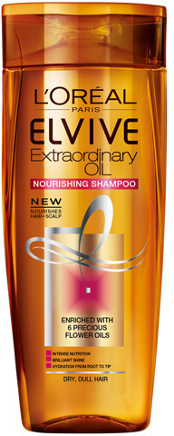 L’Oreal Paris ELVIVE Extraordinary Oil Shampoo is a shampoo for dry hair. The formula contains Nutri-Ester technology, which leaves an ultra-thin film on hair that acts as a protective top coat. It also contains rose oil to regenerate hair, lotus oil to soften, chamomile oil to soothe, tiara oil to purify, flax oil to illuminate, and sunflower oil for its antioxidant properties. The shampoo works to nourish hair without weighing it down.
