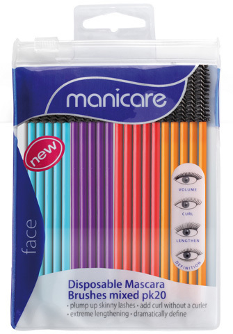 Manicare Mixed Mascara Brushes include four disposable mascara brushes to help create four different lash looks. The four brushes are differentiated by their colour. Blue can create a voluminous look while boosting your lashes. Purple is a petite brush that can be used to reach the corners of each eye and perfectly coat the bottom lashes. Red adds extra kink to naturally straight lashes; the curved wand is contoured to sweep the lashes into a curl. With an hourglass shaped brush head Orange separates each lash, allowing full coverage of mascara to create longer looking lashes.