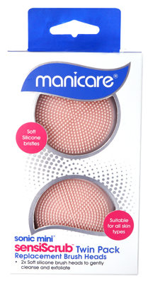 Manicare Sonic Mini SensiScrub Replacement Brush Heads Twin Pack is a pack of replacement brush heads for the Manicare Sonic Mini Rechargeable Facial Cleansing Brush. The heads have finely tapered silicone bristles to help to softly cleanse and exfoliate skin, removing dirt and impurities. The quick drying silicone bristles ensure the brush head stays ultra-hygienic. Suitable for all skin types. Recommended to replace brush head every three months. Manicare Sonic Mini Rechargeable Facial Cleansing Brush is sold seperately.