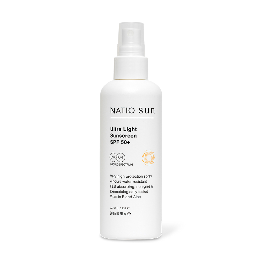 Natio Sun Ultra Light Sunscreen SPF 50+ shields skin against solar damage with this easy to apply SPF 50+ UVA/UVB broad spectrum spray sunscreen. Ideal for outdoors and active lifestyles, the spray-on formula offers very high protection with up to 4 hours water resistance. Vitamin E and Aloe help to moisturise skin and defend against moisture loss. Dermatologically tested. Suitable for children. Always follow the directions of use.