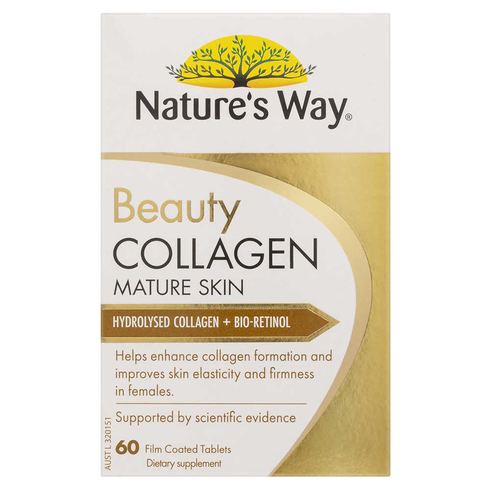 Nature’s Way Beauty Collagen Mature Skin Hydrolysed Collagen + Bio-Retinol helps enhance collagen formation and improves skin elasticity and firmness in females. Supported by scientific evidence. Always read the label and follow the directions for use.