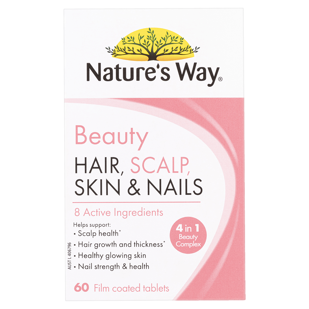 Nature’s Way Hair, Scalp, Skin & Nails is an innovative 4-in-1 beauty complex that deeply nourishes and supports luscious looking hair, healthy glowing skin and strong nails with the added benefit of supporting a healthy scalp.*
