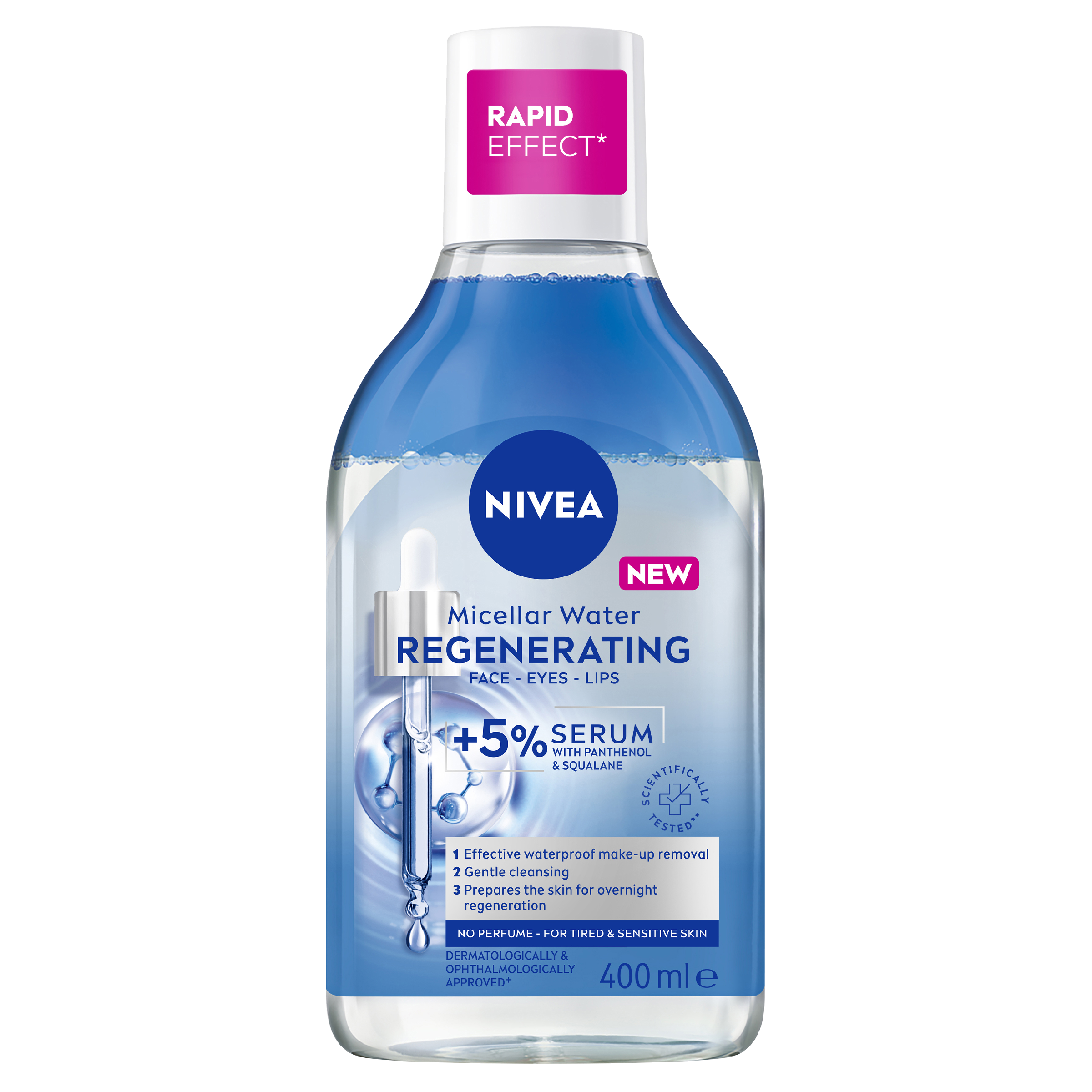 NIVEA Regenerating Micellar Water for tired and sensitive is enriched with Amino Acid Complex and 5% Serum with Panthenol & Squalane. It removes waterproof make-up, impurities and dirt with just a few featherlight swipe, leaving no greasy residue. No rubbing is needed, therefore it cleanses the skin very gently. It restores moisture and regenerates, preparing the skin for overnight regeneration for beautiful and rested looking skin the next morning. The regenerating effect is scientifically tested.